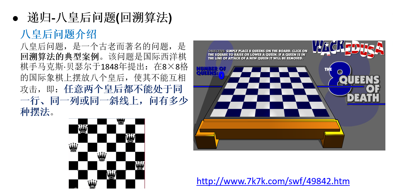 1 2 3 4 5 6 7 8 9 10 11 12 13 14 15 16 17 18 19 20 21 22 23 24 25 26 27 28 29 30 31 32 33 34 35 36 37 38 39 40 41 42 43 44 45 46 47 48 49 50 51 52 53 54 55 56 57 58 59 60 61 62 63 64 65 66 67 68 69 70 71 72 public class Queue8 { int max = 8 ; int [] array = new int [max]; static int count = 0 ; static int judgeCount = 0 ; public static void main (String[] args) { Queue8 queue8 = new Queue8(); queue8.check(0 ); System.out.println("一共有 " + count + " 种解法!!!" ); System.out.println("一共有 " + judgeCount + " 次冲突!!!" ); } private void check (int n) { if (n == max) { print(); return ; } for (int i = 0 ; i < max; i++) { array[n] = i; if (judge(n)) { check(n + 1 ); } } } private boolean judge (int n) { judgeCount++; for (int i = 0 ; i < n; i++) { if (array[i] == array[n] || Math.abs(n - i) == Math.abs(array[n] - array[i])) { return false ; } } return true ; } public void print () { count++; for (int i = 0 ; i < array.length; i++) { System.out.print(array[i] + " " ); } System.out.println(); } }