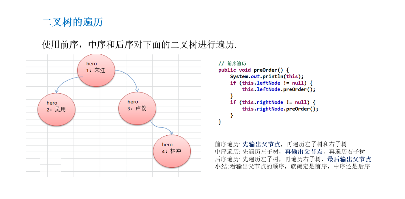 1 2 3 4 5 6 7 8 9 10 11 12 13 14 15 16 17 18 19 20 21 22 23 24 25 26 27 28 29 30 31 32 33 34 35 36 37 38 39 40 41 42 43 44 45 46 47 48 49 50 51 52 53 54 55 56 57 58 59 60 61 62 63 64 65 66 67 68 69 70 71 72 73 74 75 76 77 78 79 80 81 82 83 84 85 86 87 88 89 90 91 92 93 94 95 96 97 98 99 100 101 102 103 104 105 106 107 108 109 110 111 112 113 114 115 116 117 118 119 120 121 122 123 124 125 126 127 128 129 130 131 132 133 134 135 136 137 138 139 140 141 142 143 144 145 146 147 148 149 150 151 152 153 154 155 156 157 158 159 160 161 162 163 164 165 166 167 168 169 170 171 172 173 174 175 176 177 178 179 180 181 182 183 184 185 186 187 188 189 190 191 192 193 public class BinaryTreeTest { public static void main (String[] args) { BinaryTree binaryTree = new BinaryTree(); Node node1 = new Node(1 , "典韦" ); Node node2 = new Node(2 , "妲己" ); Node node3 = new Node(3 , "廉颇" ); Node node4 = new Node(4 , "亚瑟" ); Node node5 = new Node(5 , "后羿" ); Node node6 = new Node(6 , "女娲" ); Node node7 = new Node(7 , "张良" ); Node node8 = new Node(8 , "刘备" ); node1.setLeft(node2); node1.setRight(node3); node2.setLeft(node4); node2.setRight(node5); node3.setLeft(node6); node3.setRight(node7); node4.setLeft(node8); binaryTree.setRoot(node1); System.out.println("前序遍历:" ); binaryTree.preOrder(); System.out.println("=======================" ); System.out.println("中序遍历:" ); binaryTree.infixOrder(); System.out.println("=======================" ); System.out.println("后序遍历:" ); binaryTree.postOrder(); } } class BinaryTree { private Node root; public void setRoot (Node root) { this .root = root; } public void preOrder () { if (this .root != null ) { this .root.preOrder(); } else { System.out.println("The Binary Tree is null !!!" ); } } public void infixOrder () { if (this .root != null ) { this .root.infixOrder(); } else { System.out.println("The Binary Tree is null !!!" ); } } public void postOrder () { if (this .root != null ) { this .root.postOrder(); } else { System.out.println("The Binary Tree is null !!!" ); } } } class Node { private int no; private String name; private Node left; private Node right; public Node (int no, String name) { this .no = no; this .name = name; } public int getNo () { return no; } @Override public String toString () { return "Node{" + "no=" + no + ", name='" + name + '\'' + '}' ; } public void setNo (int no) { this .no = no; } public String getName () { return name; } public void setName (String name) { this .name = name; } public Node getLeft () { return left; } public void setLeft (Node left) { this .left = left; } public Node getRight () { return right; } public void setRight (Node right) { this .right = right; } public void preOrder () { System.out.println(this ); if (this .left != null ) { this .left.preOrder(); } if (this .right != null ) { this .right.preOrder(); } } public void infixOrder () { if (this .left != null ) { this .left.infixOrder(); } System.out.println(this ); if (this .right != null ) { this .right.infixOrder(); } } public void postOrder () { if (this .left != null ) { this .left.postOrder(); } if (this .right != null ) { this .right.postOrder(); } System.out.println(this ); } }