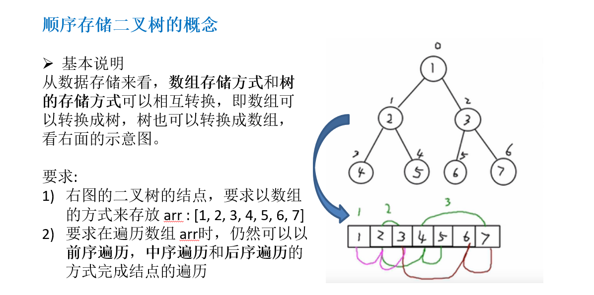 1 2 3 4 5 6 7 8 9 10 11 12 13 14 15 16 17 18 19 20 21 22 23 24 25 26 27 28 29 30 31 32 33 34 35 36 37 38 39 40 41 42 43 44 45 46 47 48 49 50 51 52 53 54 55 56 57 58 59 60 public class ArrayBinaryTreeTest { public static void main (String[] args) { int [] arr = {1 , 2 , 3 , 4 , 5 , 6 , 7 }; ArrayBinaryTree arrayBinaryTree = new ArrayBinaryTree(arr); arrayBinaryTree.preOrder(); } } class ArrayBinaryTree { private int [] arr; public ArrayBinaryTree (int [] arr) { this .arr = arr; } public void preOrder () { this .preOrder(0 ); } public void preOrder (int index) { if (arr == null || arr.length == 0 ) { System.out.println("The array is empty !!!" ); } System.out.println(arr[index]); if ((index * 2 + 1 ) < arr.length) { preOrder(2 * index + 1 ); } if ((index * 2 + 2 ) < arr.length) { preOrder(2 * index + 2 ); } } }