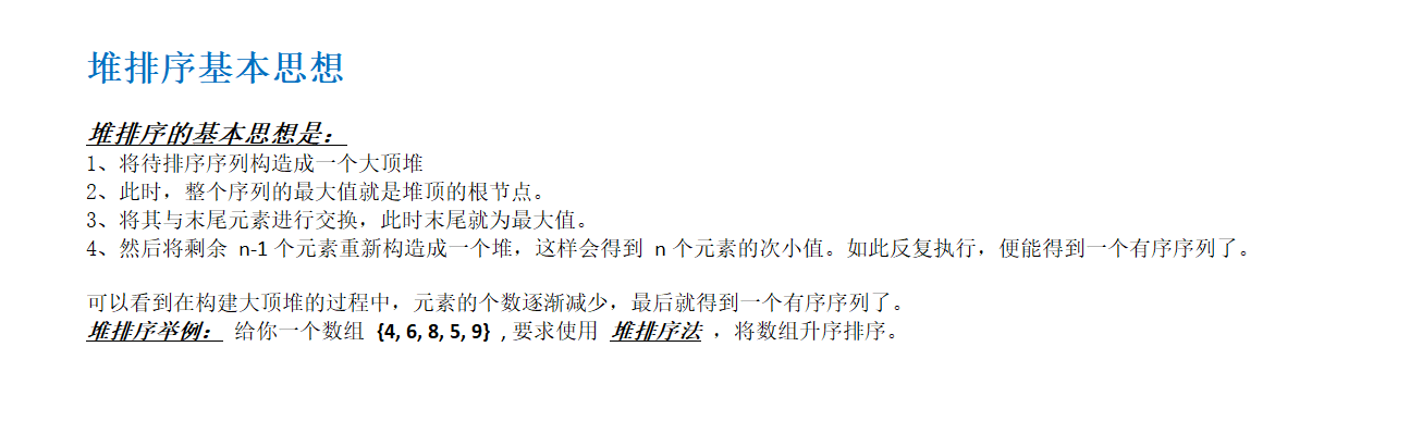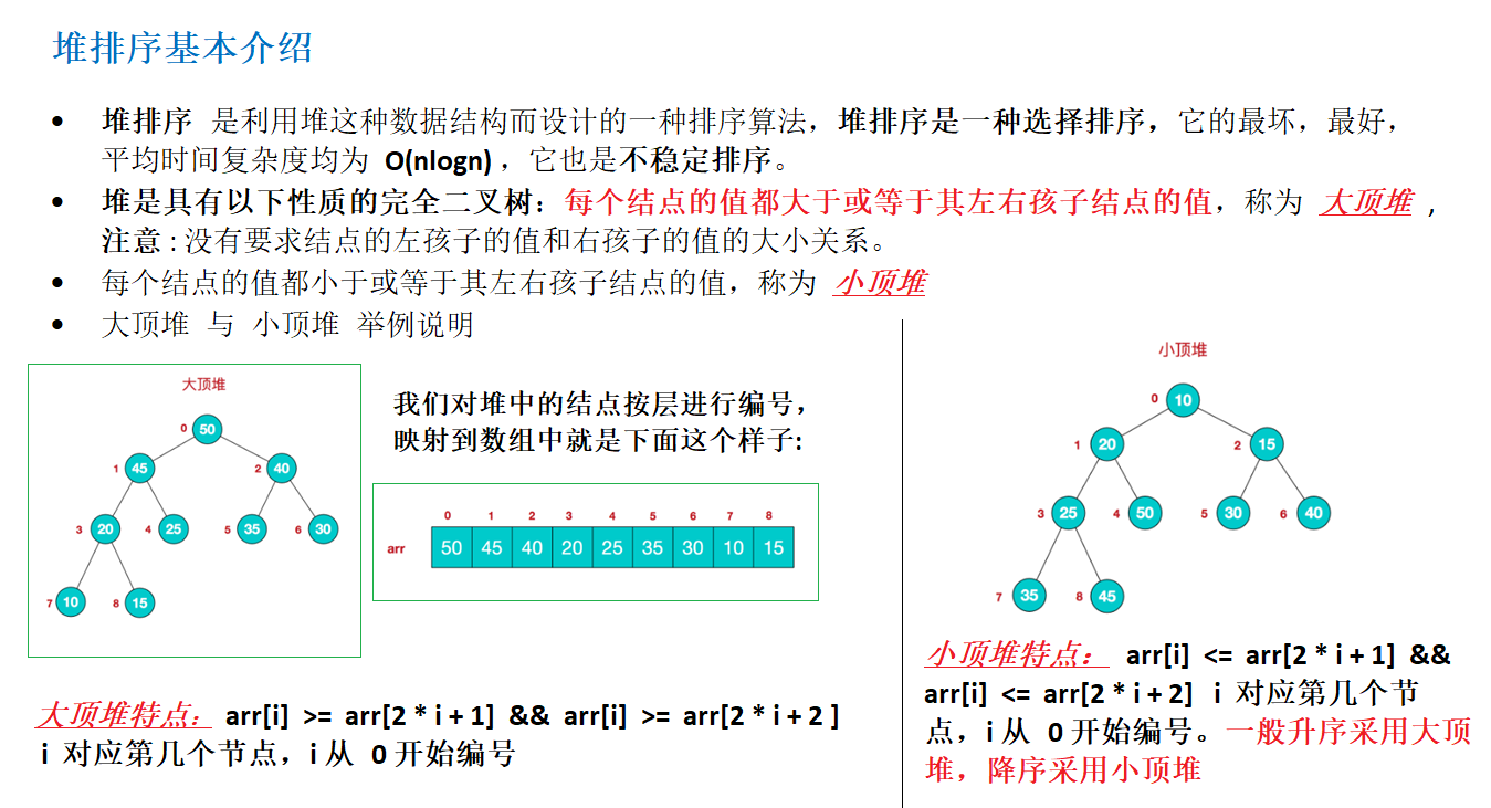 堆排序 堆排序 是一种选择排序 ,是利用 堆 这种数据结构而设计的一种排序算法。具体介绍如下图: