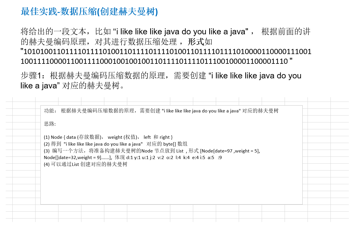 1 2 3 4 5 6 7 8 9 10 11 12 13 14 15 16 17 18 19 20 21 22 23 24 25 26 27 28 29 30 31 32 33 34 35 36 37 38 39 40 41 42 43 44 45 46 47 48 49 50 51 52 53 54 55 56 57 58 59 60 61 62 63 64 65 66 67 68 69 70 71 72 73 74 75 76 77 78 79 80 public static void main (String[] args) { String str = "i like like like java do you like a java" ; byte [] bytes = str.getBytes(); System.out.println("压缩前的长度是:" + bytes.length); String src = "F:\\src.jpg" ; String desc = "F:\\dest.zip" ; zipFile(src, desc); } public static void zipFile (String srcFile, String destFile) { OutputStream os = null ; ObjectOutputStream oos = null ; FileInputStream fis = null ; try { fis = new FileInputStream(srcFile); byte [] bytes = new byte [fis.available()]; fis.read(bytes); byte [] huffmanBytes = huffmanZip(bytes); os = new FileOutputStream(destFile); oos = new ObjectOutputStream(os); oos.writeObject(huffmanBytes); oos.writeObject(huffmanCodes); } catch (Exception e) { System.out.println(e.getMessage()); } finally { try { oos.close(); os.close(); fis.close(); } catch (Exception e) { System.out.println(e.getMessage()); } } }