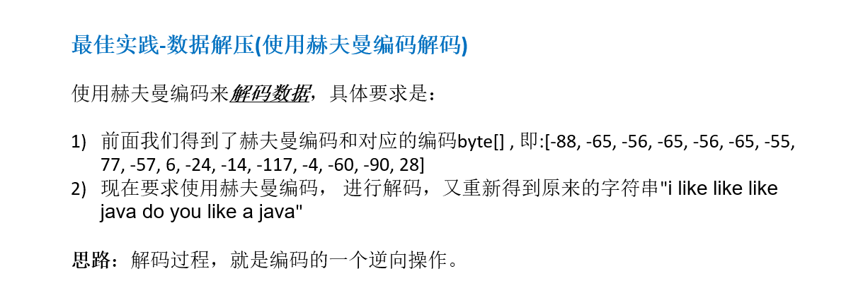 1 2 3 4 5 6 7 8 9 10 11 12 13 14 15 16 17 18 19 20 21 22 23 24 25 26 27 28 29 30 31 32 33 34 35 36 37 38 39 40 41 42 43 44 45 46 47 48 49 50 51 52 53 54 55 56 57 58 59 60 61 62 63 64 65 66 67 68 69 70 71 72 73 74 75 76 77 78 79 80 public static void main (String[] args) { String str = "i like like like java do you like a java" ; byte [] bytes = str.getBytes(); System.out.println("压缩前的长度是:" + bytes.length); String src = "F:\\src.jpg" ; String desc = "F:\\dest.zip" ; unZipFile(desc, src); } public static void unZipFile (String zipFile, String destFile) { InputStream is = null ; ObjectInputStream ois = null ; OutputStream os = null ; try { is = new FileInputStream(zipFile); ois = new ObjectInputStream(is); byte [] huffmanBytes = (byte []) ois.readObject(); Map<Byte, String> huffmanCodes = (Map<Byte, String>) ois.readObject(); byte [] bytes = decode(huffmanCodes, huffmanBytes); os = new FileOutputStream(destFile); os.write(bytes); } catch (Exception e) { System.out.println(e.getMessage()); } finally { try { os.close(); ois.close(); is.close(); } catch (Exception e) { System.out.println(e.getMessage()); } } }