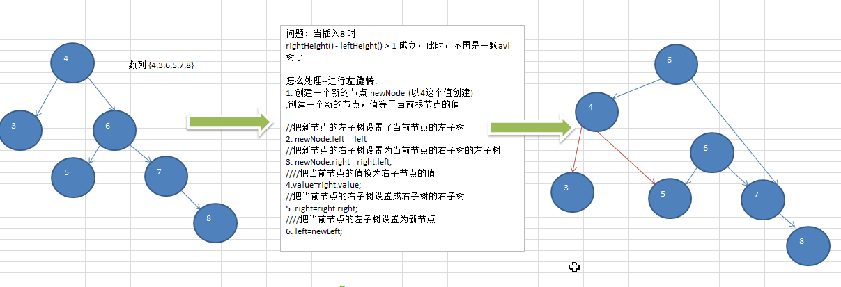 左旋转 对二叉排序树进行左旋转,即变成了平衡二叉树。 由上面代码发现,左右两颗子树的高度差的绝对值超过了 1 ,且右子树高于左子树, 所有需要进行 左旋转 。左旋转思路分析 如下图: