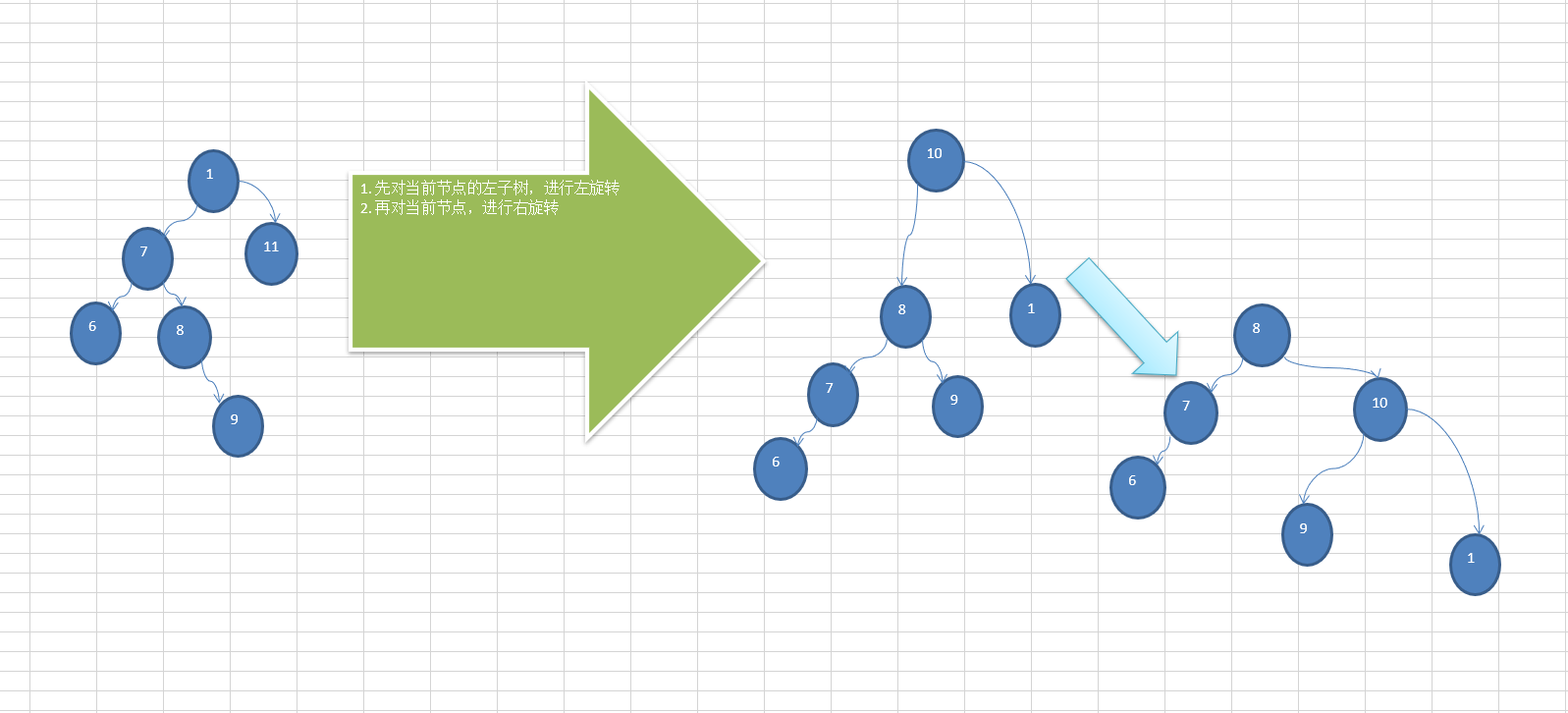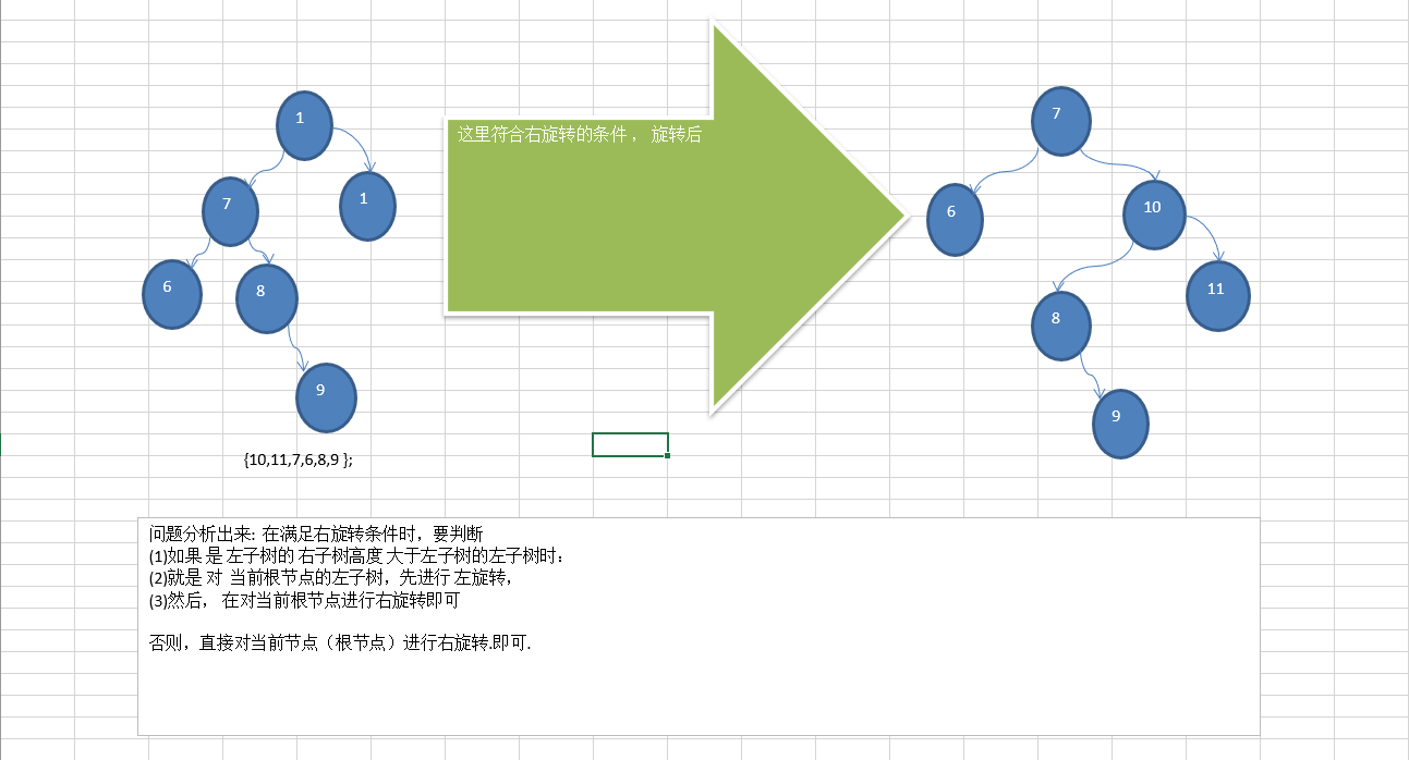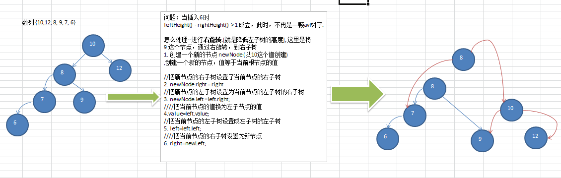 右旋转 对二叉排序树进行右旋转,即变成了平衡二叉树。 由上面代码发现,左右两颗子树的高度差的绝对值超过了 1 ,且左子树高于右子树, 所有需要进行 右旋转 。右旋转思路分析 如下图:
