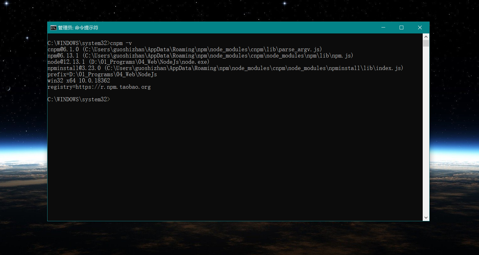 安装完成后,查看 cnpm 版本,截图如下: