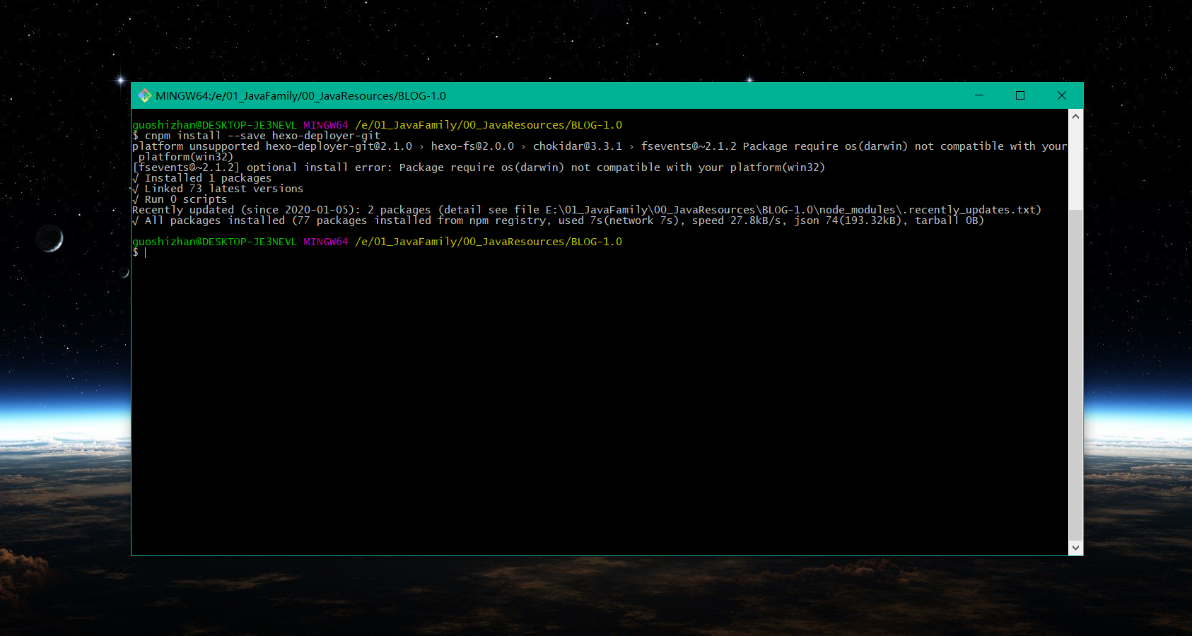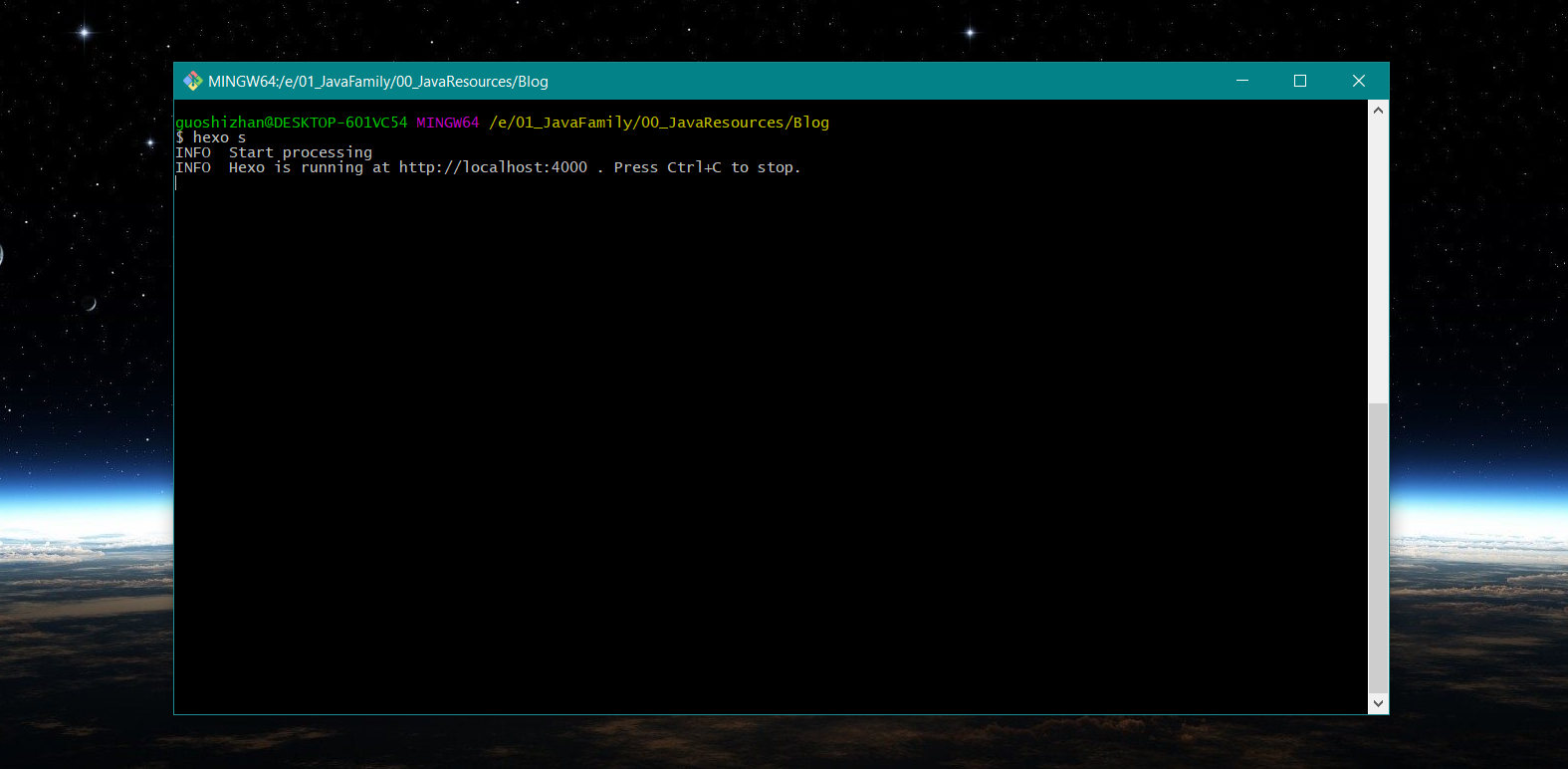 复制完成之后保存,回到 git 窗口,使用 pwd 目录查看当前所处的目录,如果不是在 Blog 目录下,请切换到这个目录,然后 hexo g,hexo s。最终效果如图:
