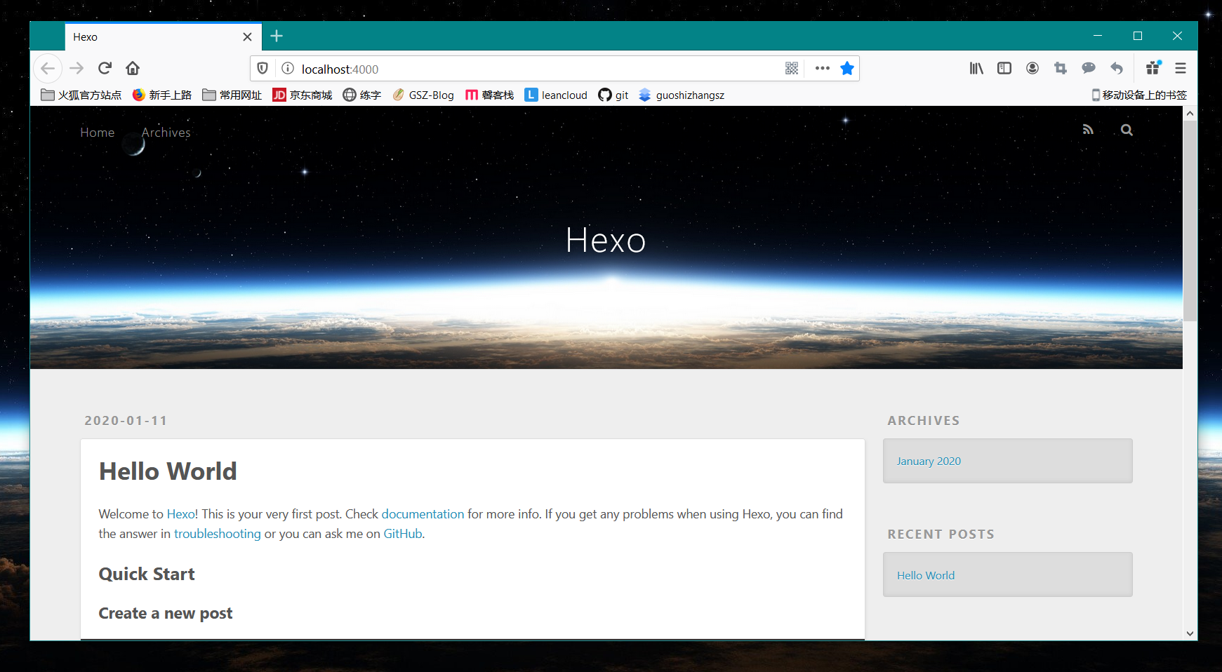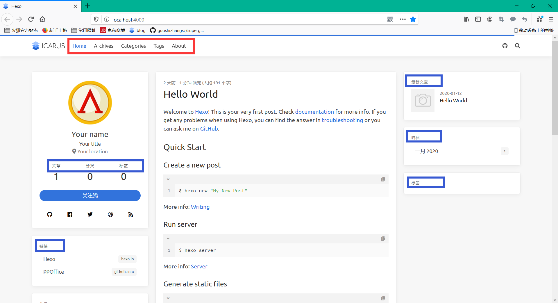 修改完成之后保存,hexo g,hexo s 即可。若看到以下蓝色框部分是中文,那么语言修改成功了。如图所示: