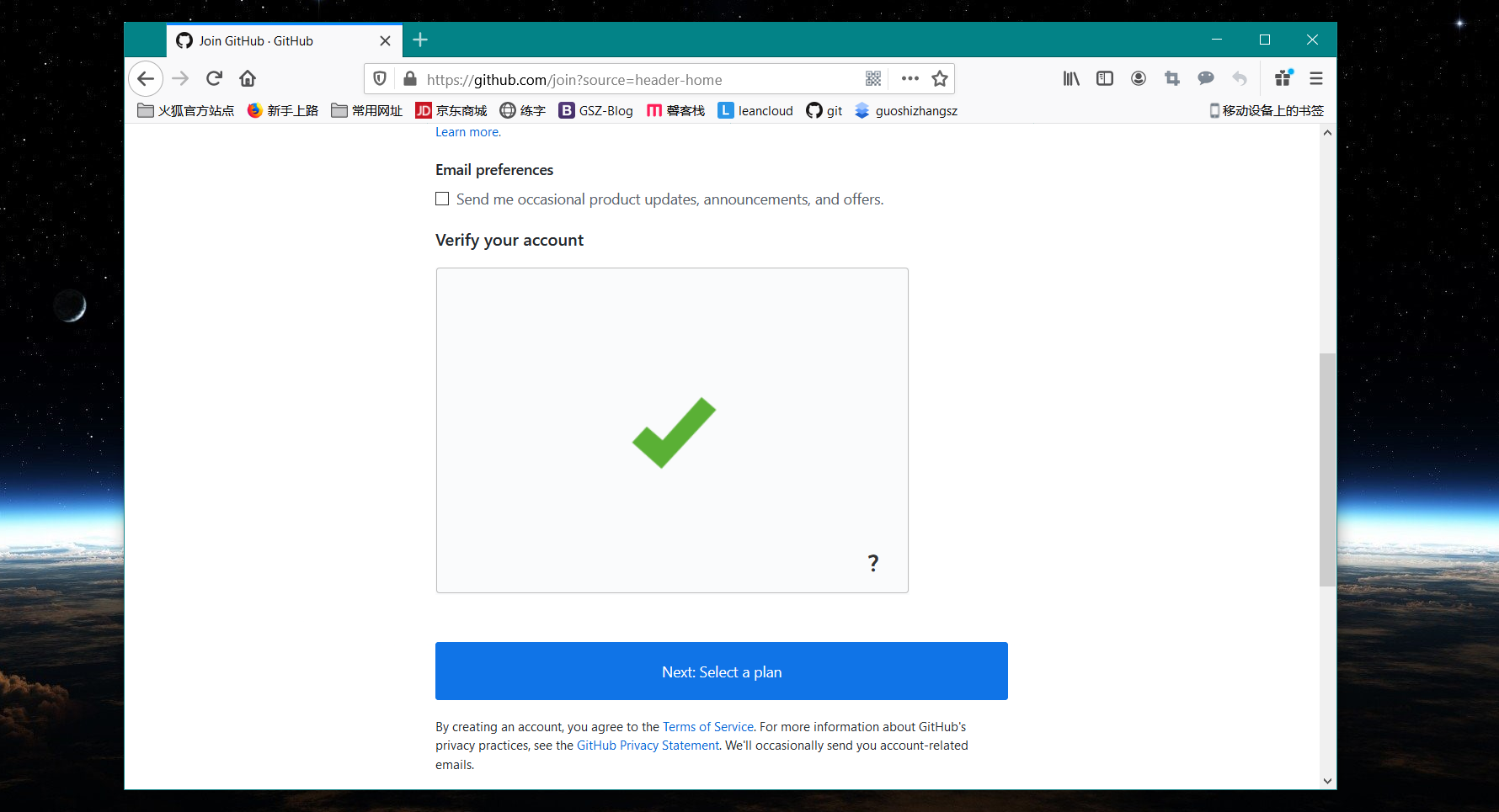 后面有一些题目,跳过即可,然后你的邮箱会收到 GitHub 的验证消息,然后验证,你就有了Github 账号。示例如下: