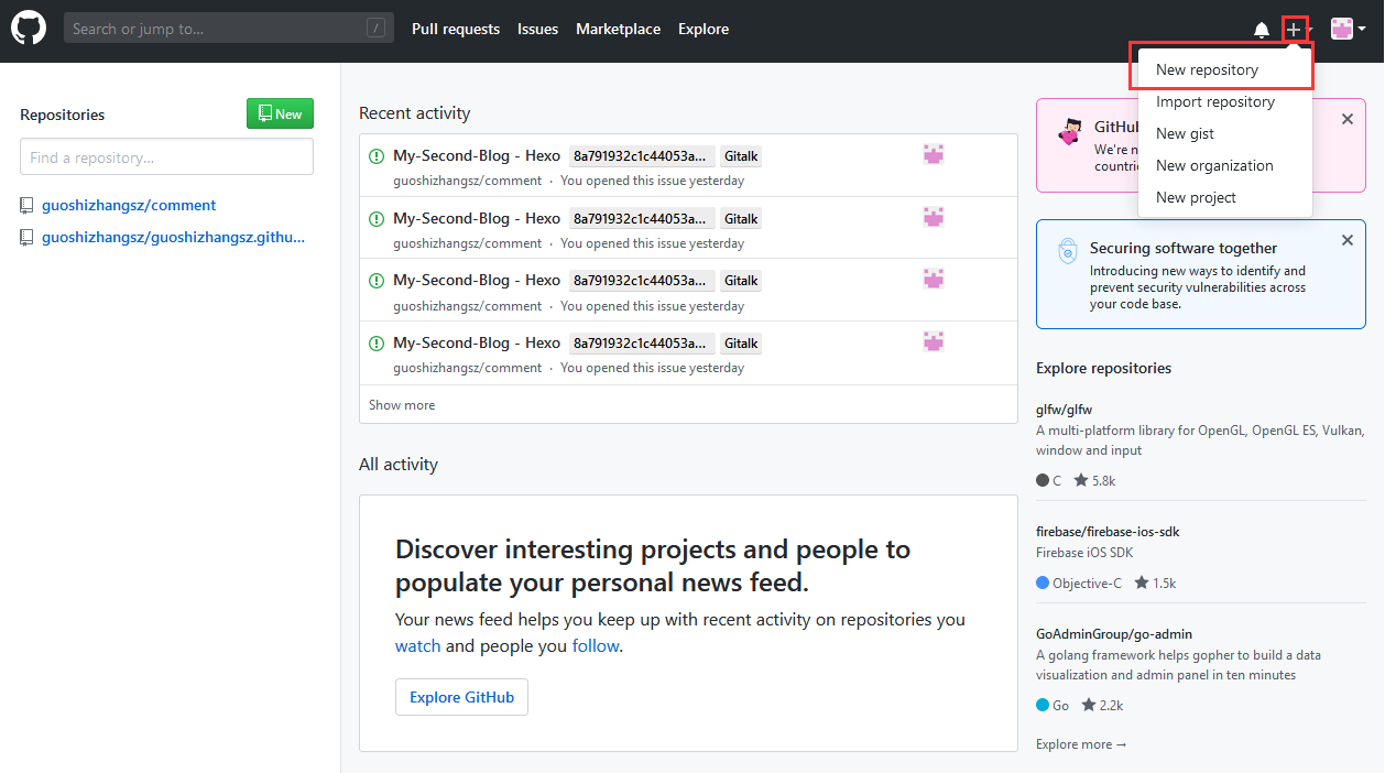 新建一个 GitHub 仓库,点击右上角“+”号,然后 New repository,如下图:
