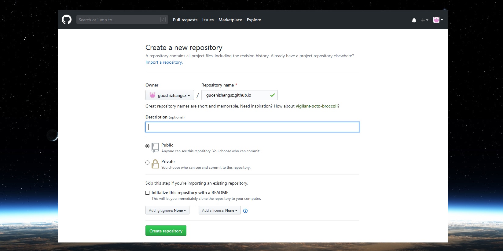 非常非常重要的一点,仓库的名字是固定的。格式必须为:GitHub昵称.github.io,填完仓库名点击绿色按钮即可,示例如下:
