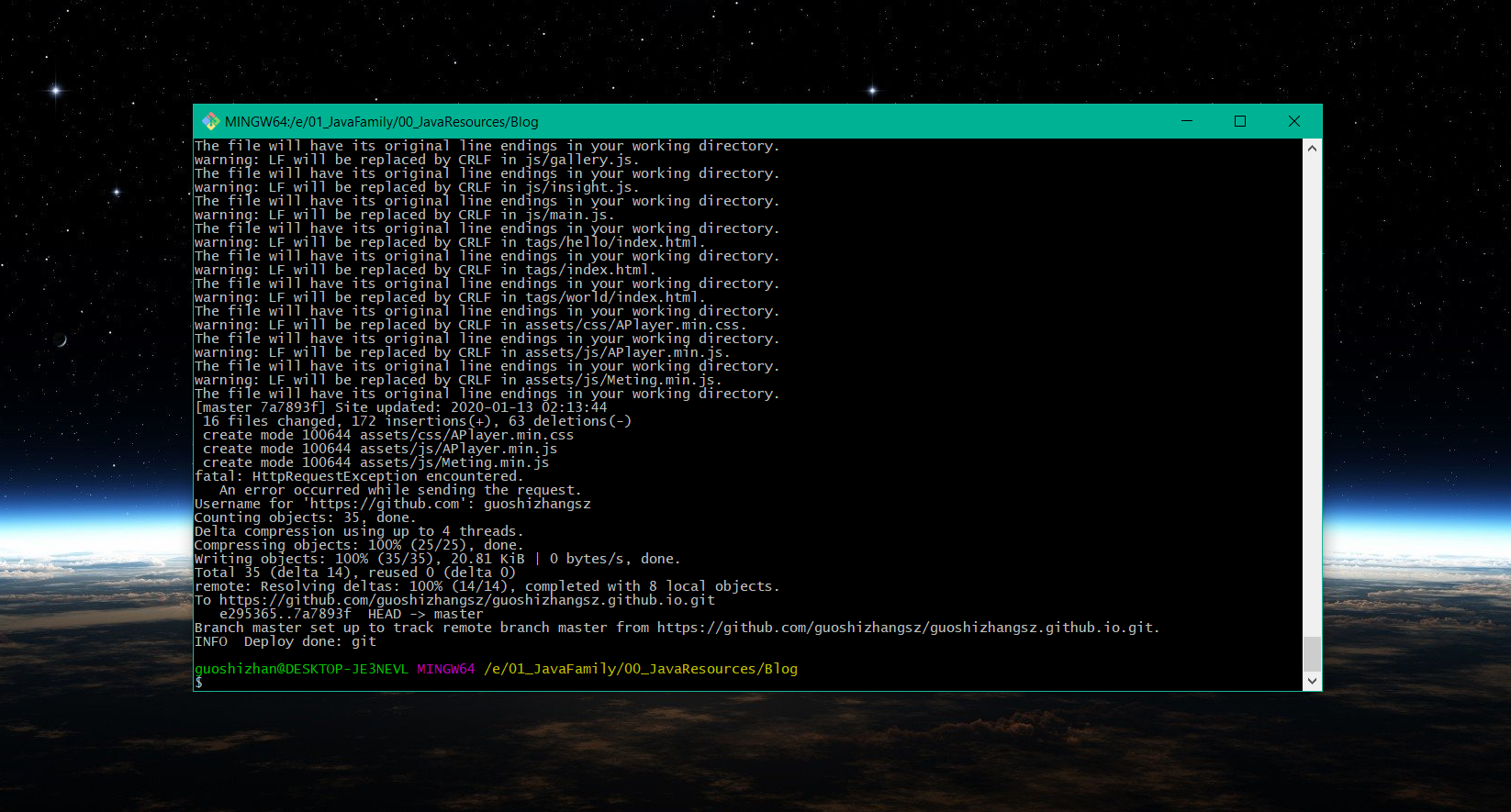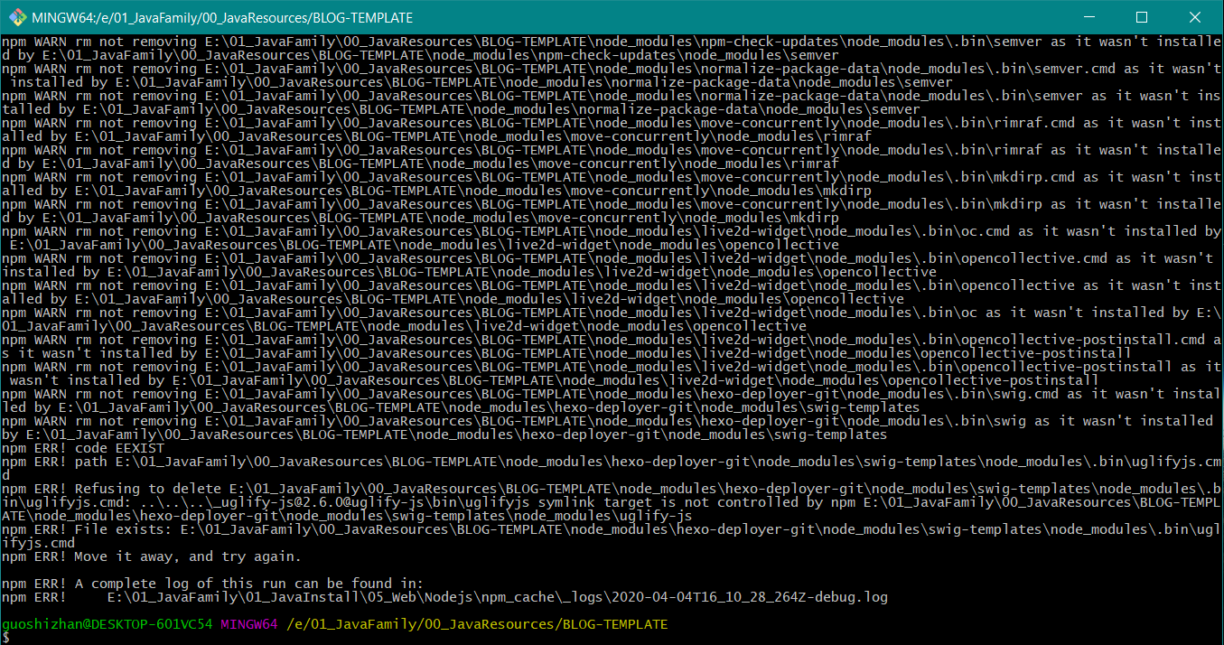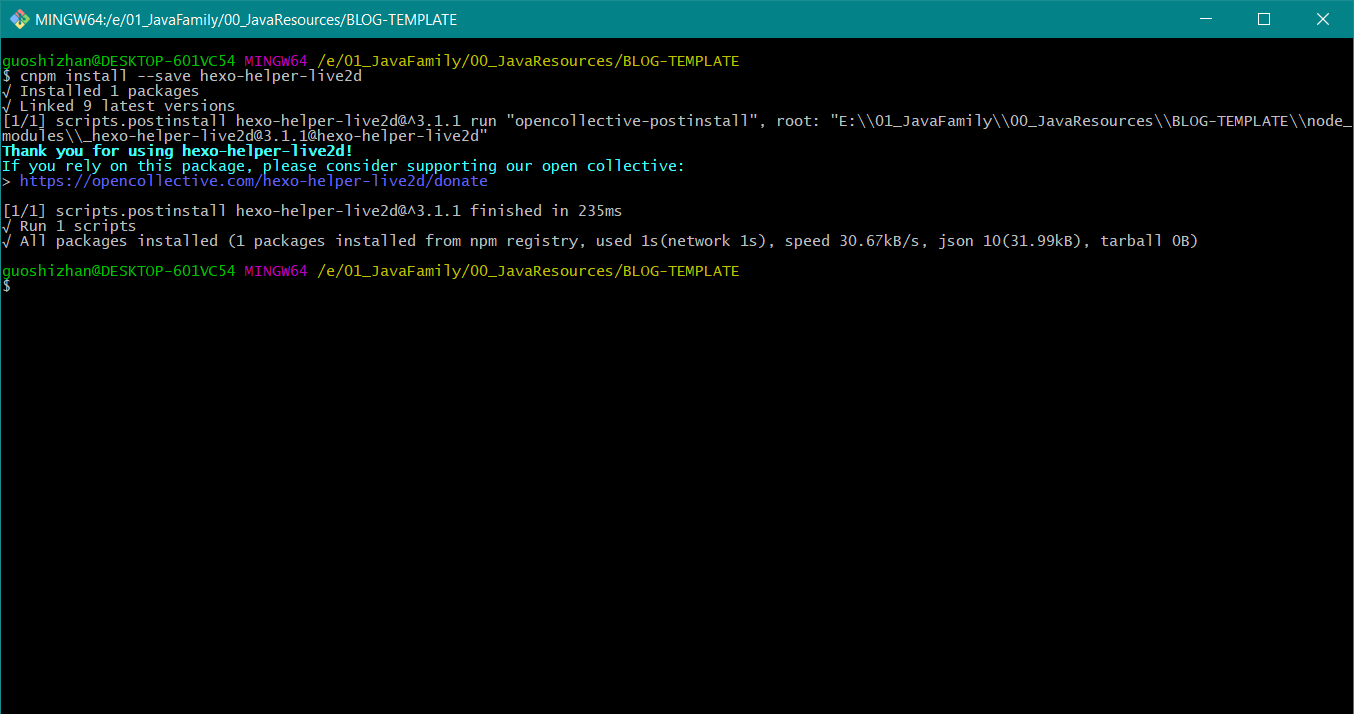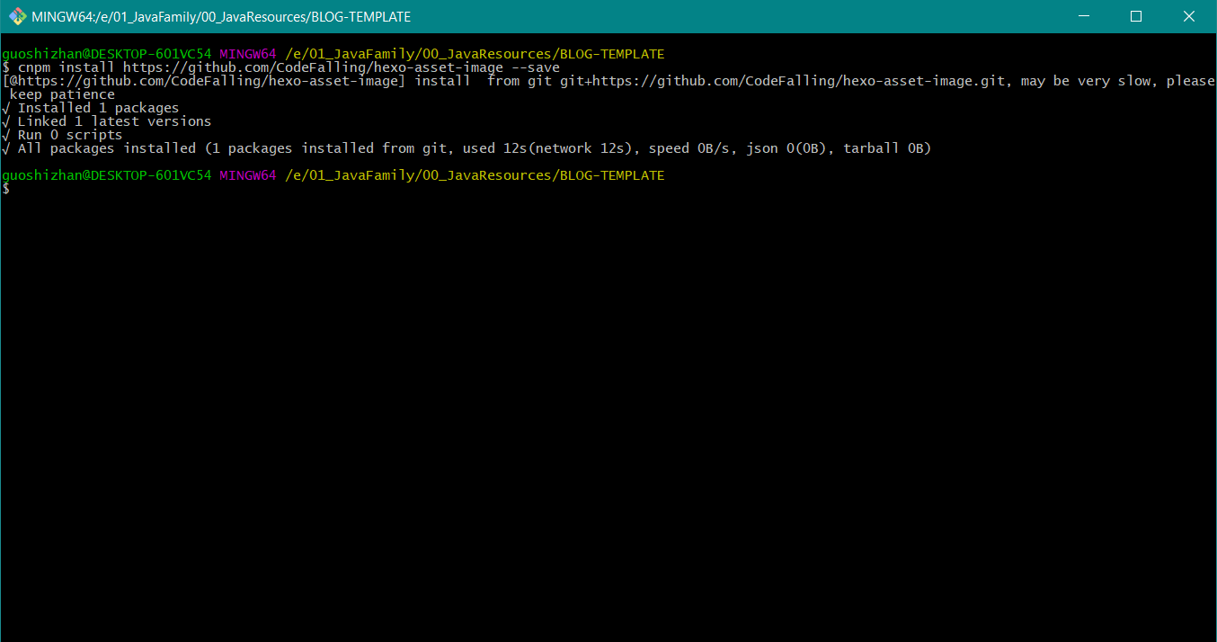 安装完成之后去blog目录下的配置文件中修改 post_asset_folder,把它的值改为 true,然后保存。回到 Git 窗口,重新使用新建文章命令,如图所示: