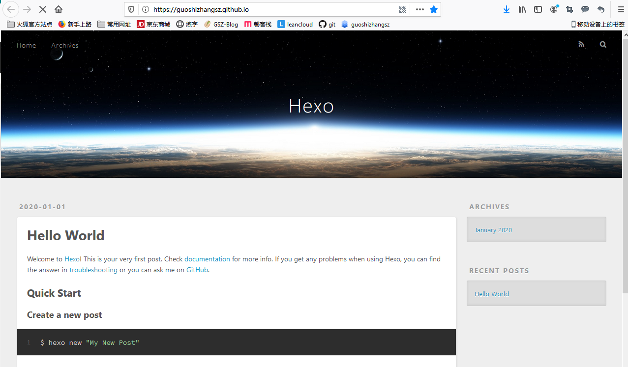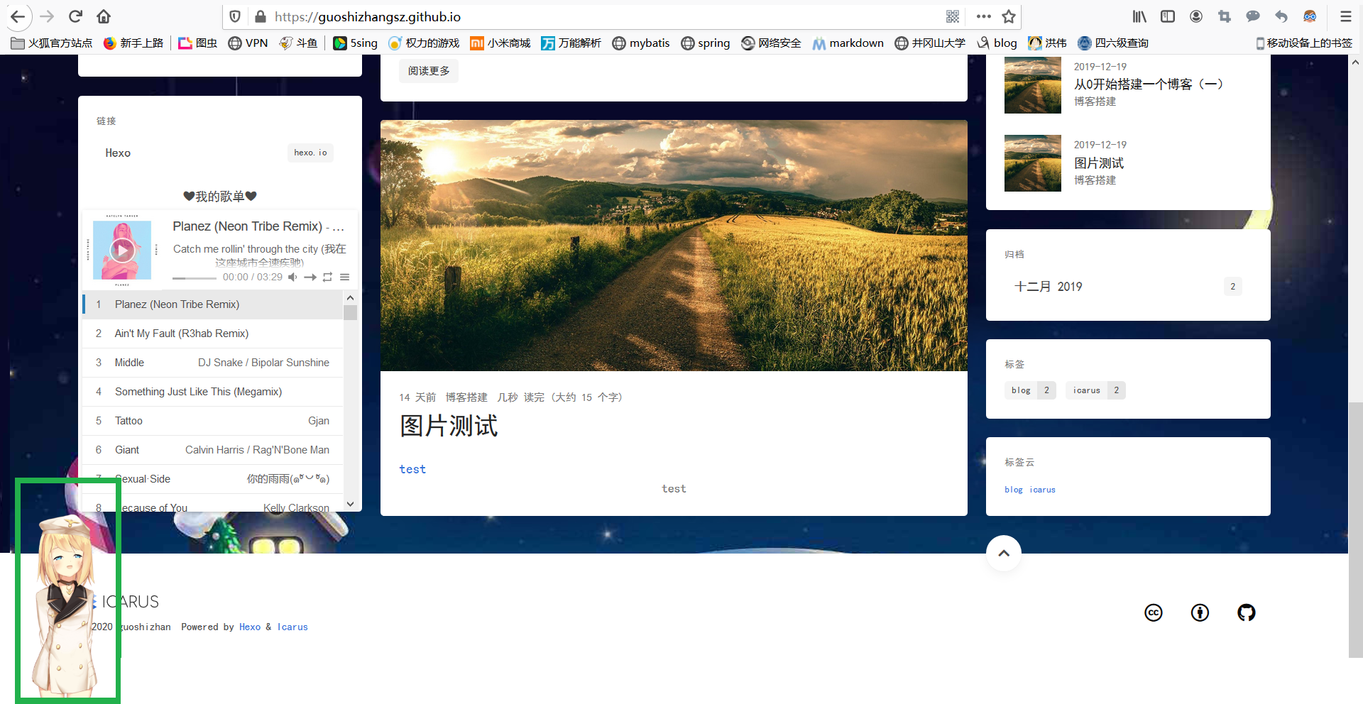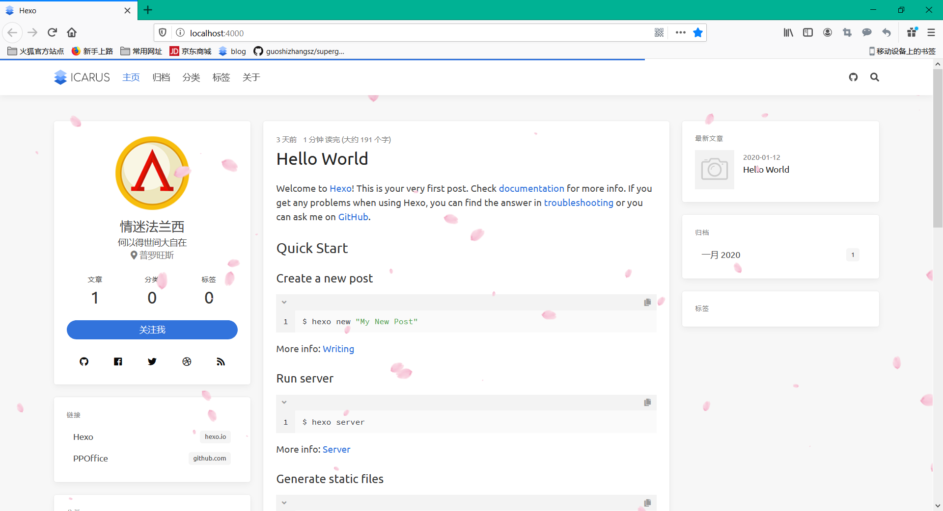 background01.jpg是themes/icarus/source/images文件夹下的图片,自己在这个文件夹添加自己的背景图片即可,图片名字随意。然后把avatar.png图片删掉,换一个你自己喜欢的头像,但名字仍然要是avatar.png,这样就修改好了博客头像。当然可以去其他地方进行配置,这就自己去研究了。然后hexo clean,hexo g,hexo s。最终效果如下图: