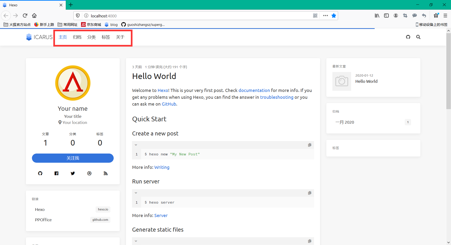 修改完成之后保存,hexo g,hexo s即可。若结果和下图一样,那么修改成功!