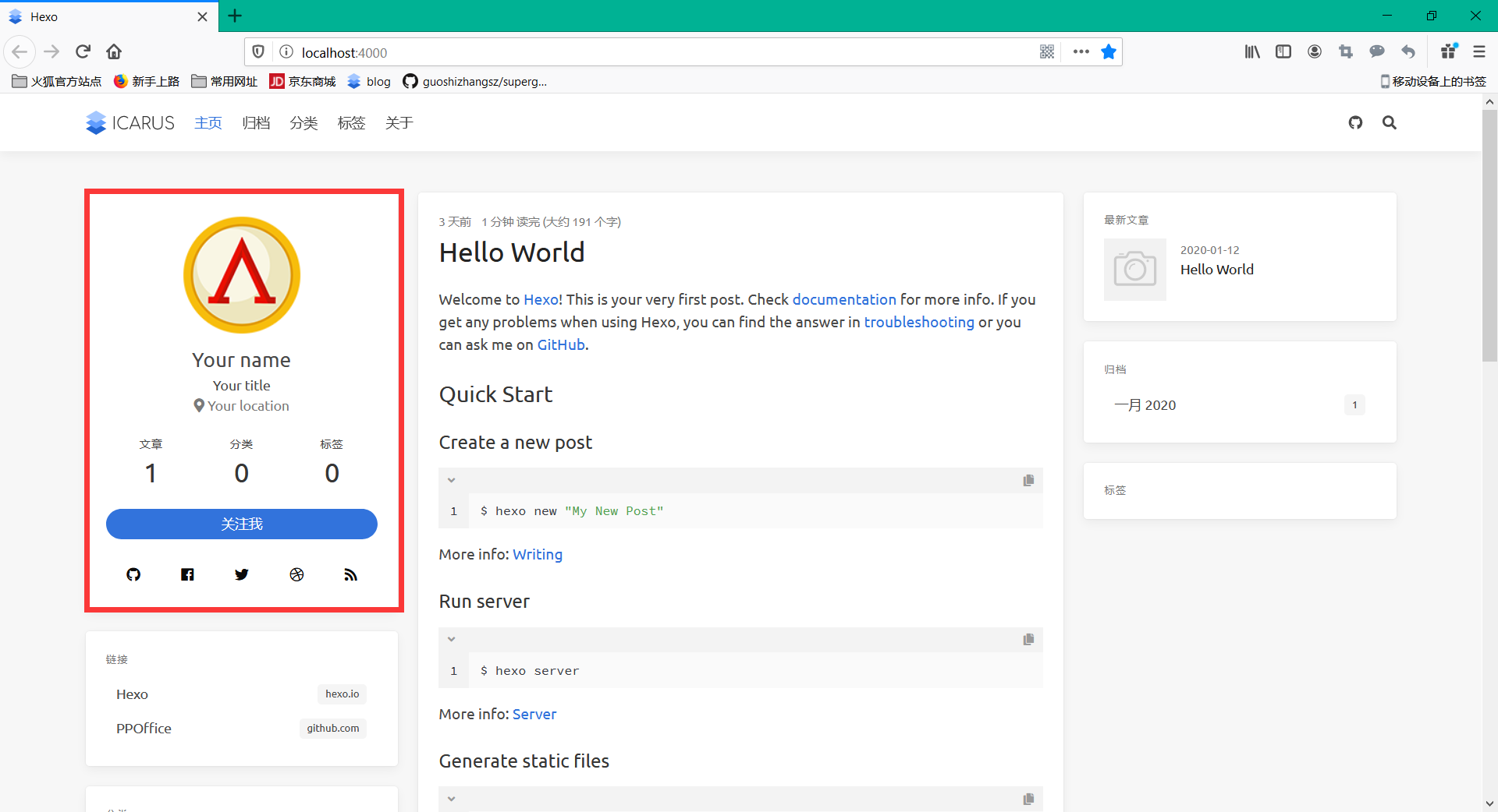把自己的名字、标题和位置修改就行了。还有一项,把这个配置文件的115行和120行修改为 true。建议把它修改为 true。不修改的话,左右两边侧栏会随着页面的滚动而滚动。到这里为止,icarus 主题的基本美化就搞定了。最终效果如下图: