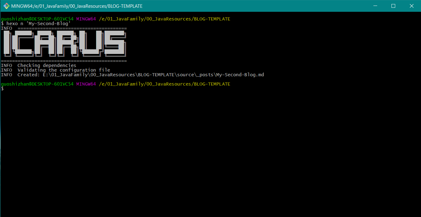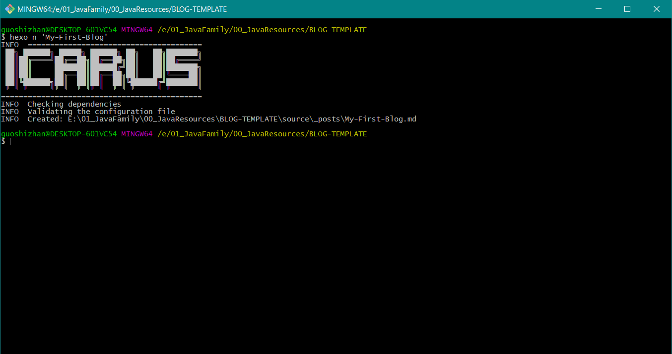 1 | hexo n "My-First-Blog" |