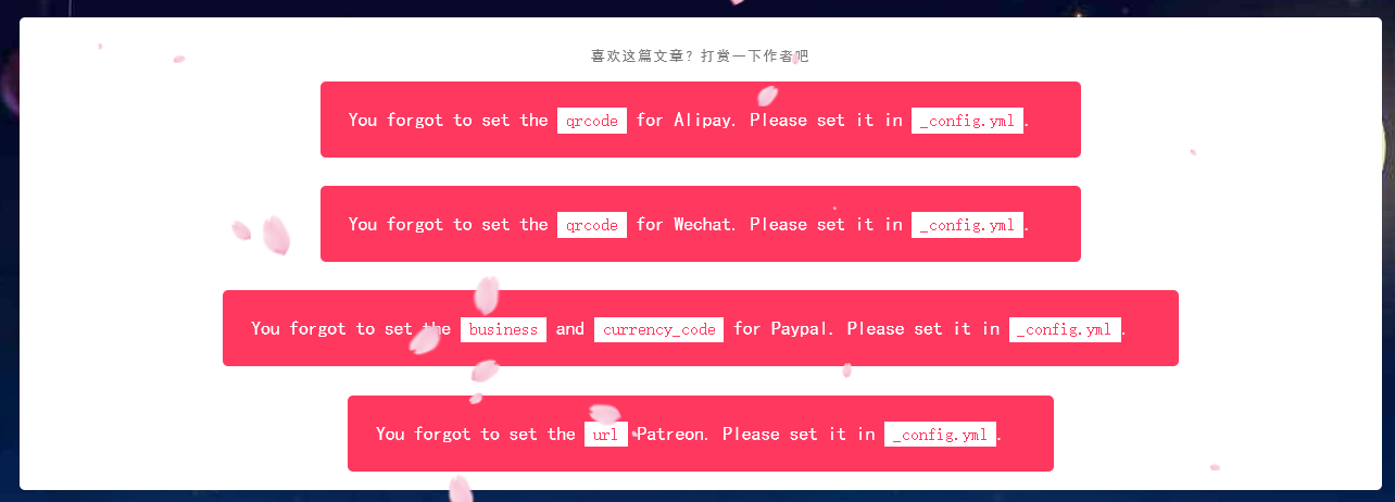 就是把你的微信或支付宝收款码放到 icarus/source/images 目录下,上述图片路径就是这个路径。其他的打赏方式注释或者删除掉就可以了。若要保留,给它们配置图片即可。好了,打赏功能就配置好了。